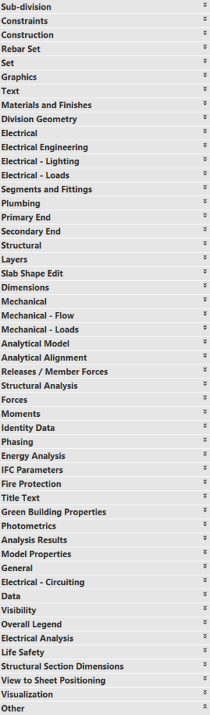 Years ago I pondered how do Revit organize the Property sets once a family is loaded into a project. It has been several years and Revit has introduces several new features and Object Styles so I was wondering what new property set had been introduces. Revit 2026 has 6 new sets compared to my last post: Sub-division, Electrical Analysis, Life Safety, Structural Section Dimensions, View to Sheet Position, and Visualization. They aren’t displayed alphabetically but in what seems to be a random order (as seen in the image below). I often take this into consideration when grouping parameters in my families and projects, as I want more common values in groupings towards the top. With this new information in hand I might have to move some of my Room/Area values for code into the Life Safety grouping so they will be towards the bottom of the list.